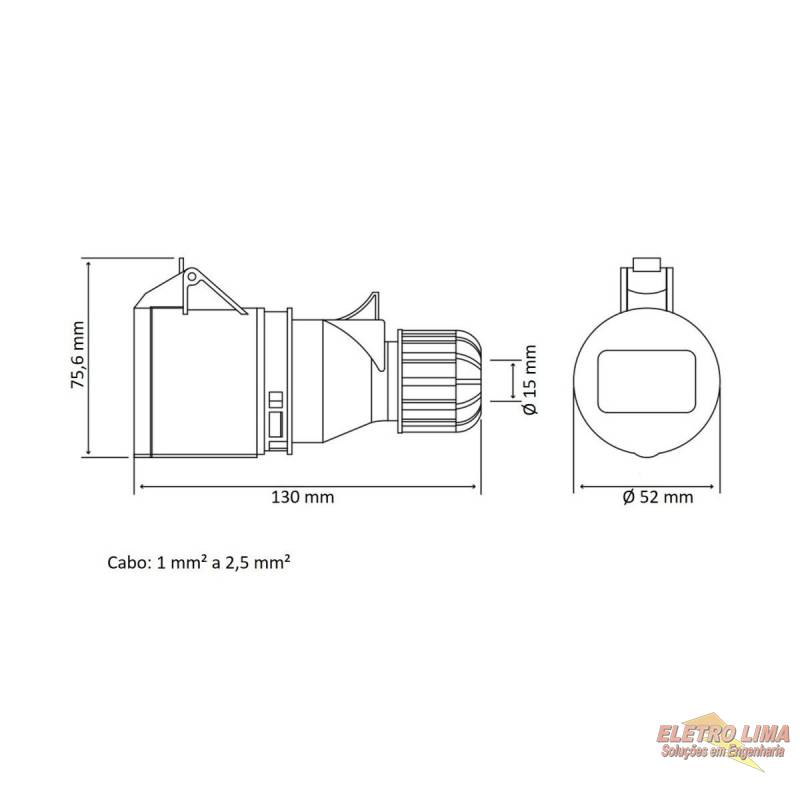 TOMADA DE ACOPLAMENTO INDUSTRIAL 2P+T 220V 6h - COM PRENSA CABO.